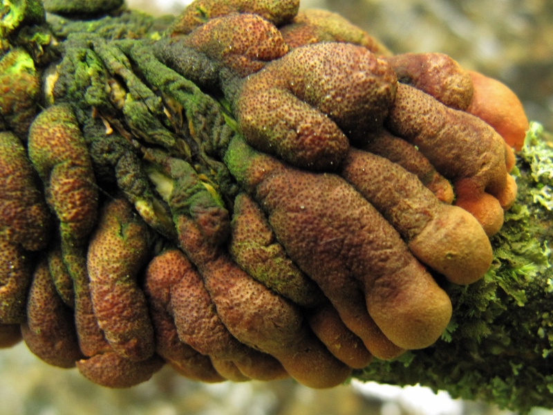 2. Trollhand (Hypocreopsis lichenoides) ... mutmaßlicher Pilzparasit (vor allem an Tabakbrauner Borstenscheibe Hymenochaete tabacina - meist an Weidenästen in Feuchtgebüschen (Aufnahme L. Krieglsteiner in Luxemburg)